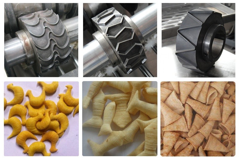 high efficiency and little pollution. The raw materials can be rice powder, corn powder, wheat flour individually or their mixture. Only by changing the moulds, shaping or cutting machine, the shapes can be various: like sticks, square sheet rib chips, diamond chips, wavy chips, pillow shapes .